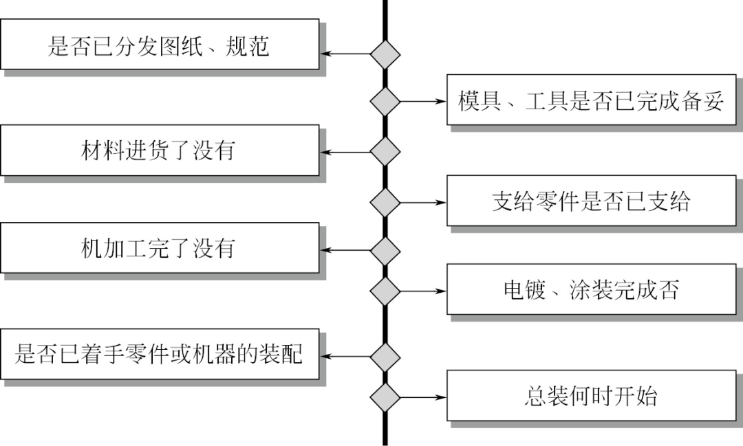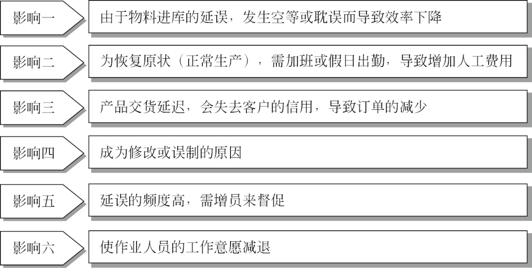 有可能延遲交貨的物料,應(yīng)予早期發(fā)現(xiàn),從而防止其發(fā)生,同時也應(yīng)抑制無理由的提早交貨。交期的延遲,毫無疑問會妨礙生產(chǎn)活動的順利進(jìn)行,對生產(chǎn)現(xiàn)場及其有關(guān)部門將帶來有形、無形的不良影響(圖1)。
