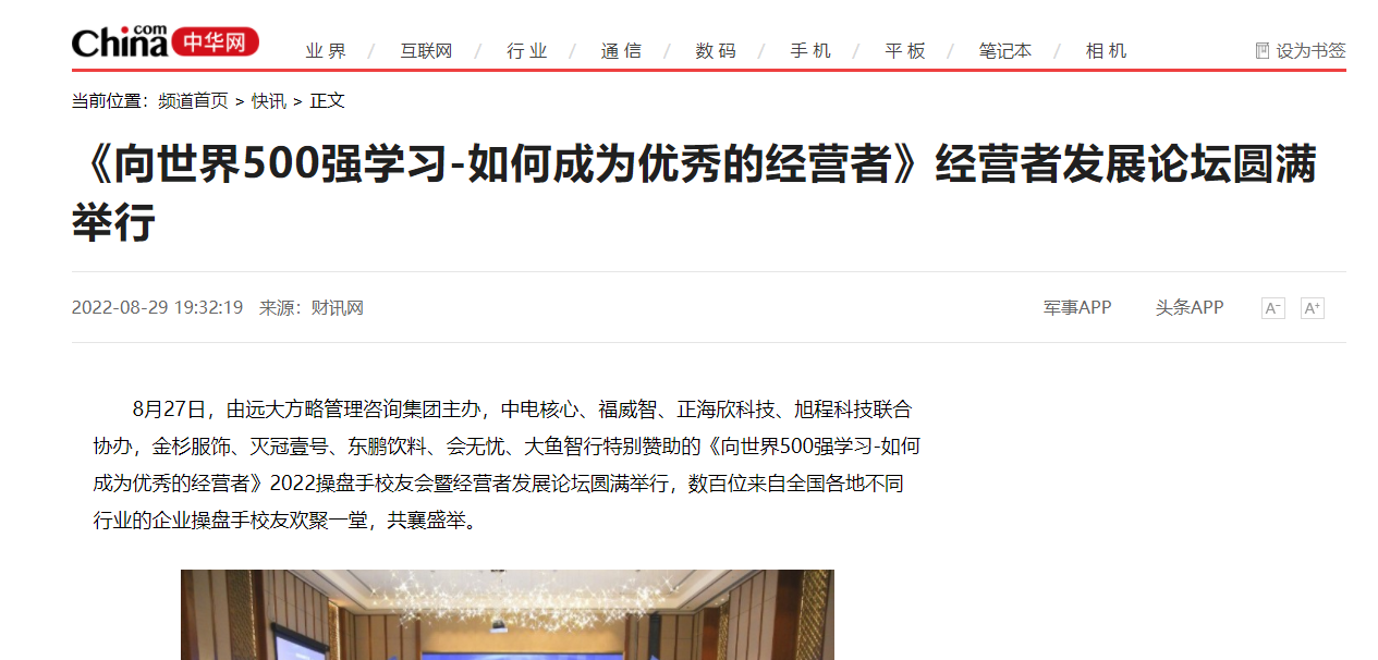 8月27日,由遠大方略管理咨詢集團主辦,中電核心、福威智、正海欣科技、旭程科技聯(lián)合協(xié)辦,金杉服飾、滅冠壹號、東鵬飲料、會無憂、大魚智行特別贊助的《向世界500強學習-如何成為優(yōu)秀的經(jīng)營者》2022操盤手校友會暨經(jīng)營者發(fā)展論壇圓滿舉行,數(shù)百位來自全國各地不同行業(yè)的企業(yè)操盤手校友歡聚一堂,共襄盛舉。